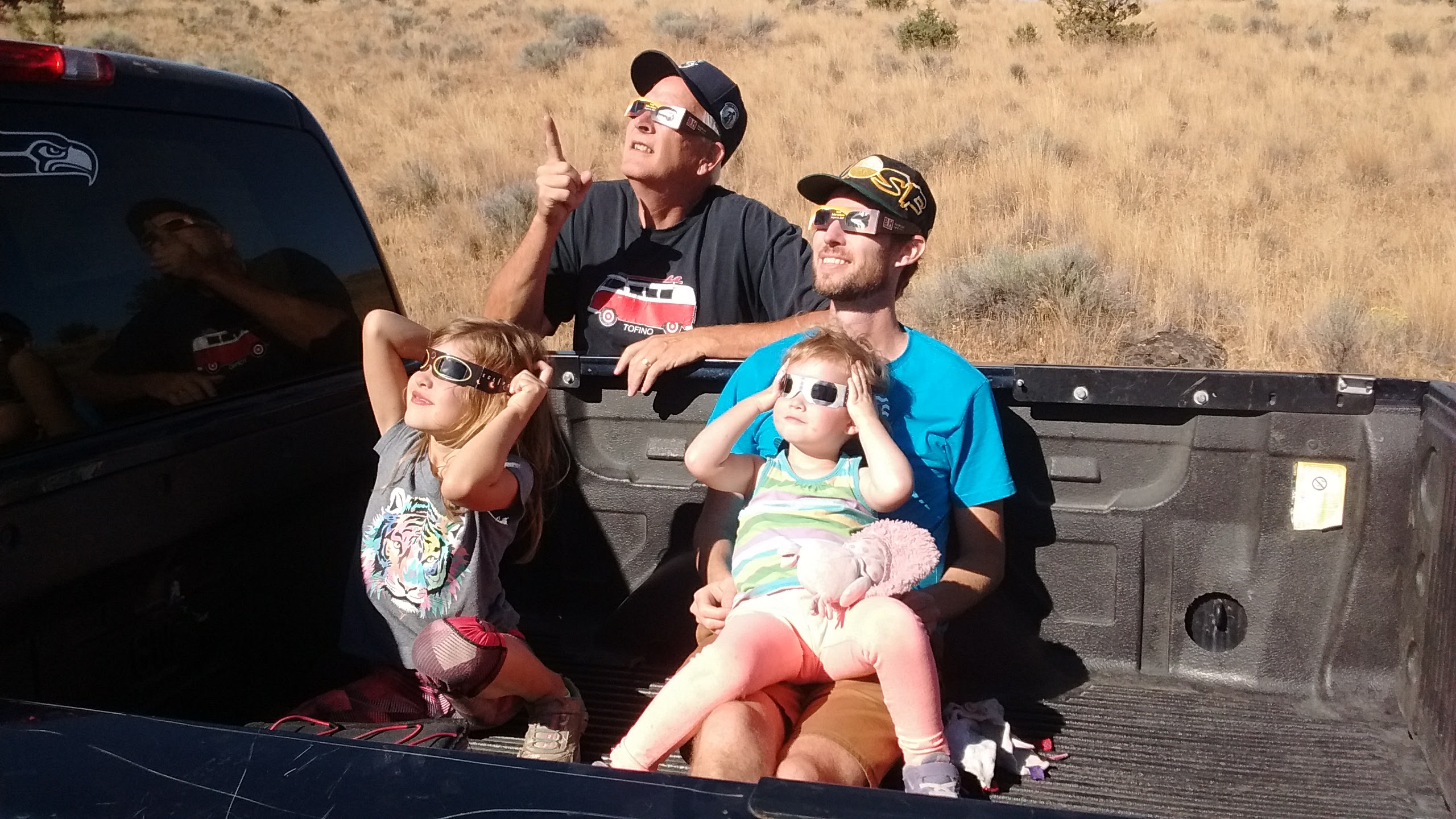 I continued the turn counter clockwise until I was facing south, gazing on Mt. Hood across the Columbia River and into Oregon, a distant but familiar face that so captivated my dad when the blue and white tails of the brightest comet in history, Hale-Bopp, streaked over her summit in 1997 a thousand times brighter and thirty-nine times more deadly than Halley’s comet (which I watched fly from the top of his shoulders when I was 10). Thirty-one years after Halley and twenty years after Hale-Bopp, dad and I drove to central Oregon with my husband and two very young daughters, pulled off to the side of a desert road, plastered paper and plastic glasses to our eyes, and were totally eclipsed for two minutes and forty seconds.